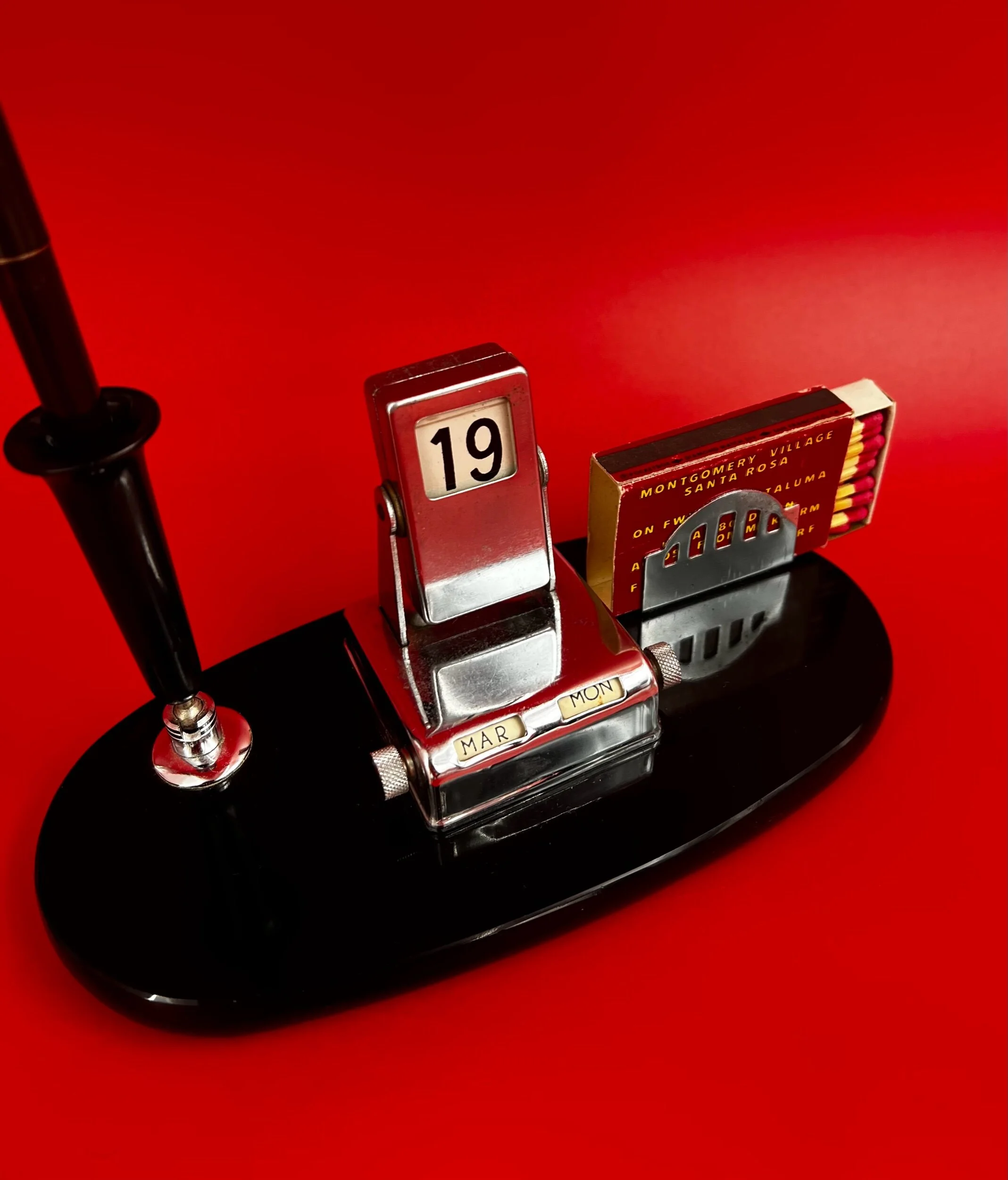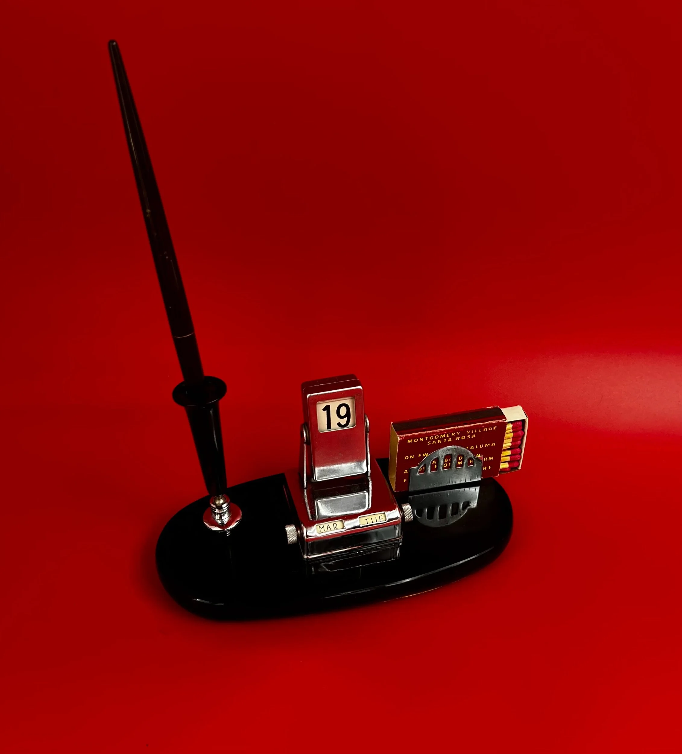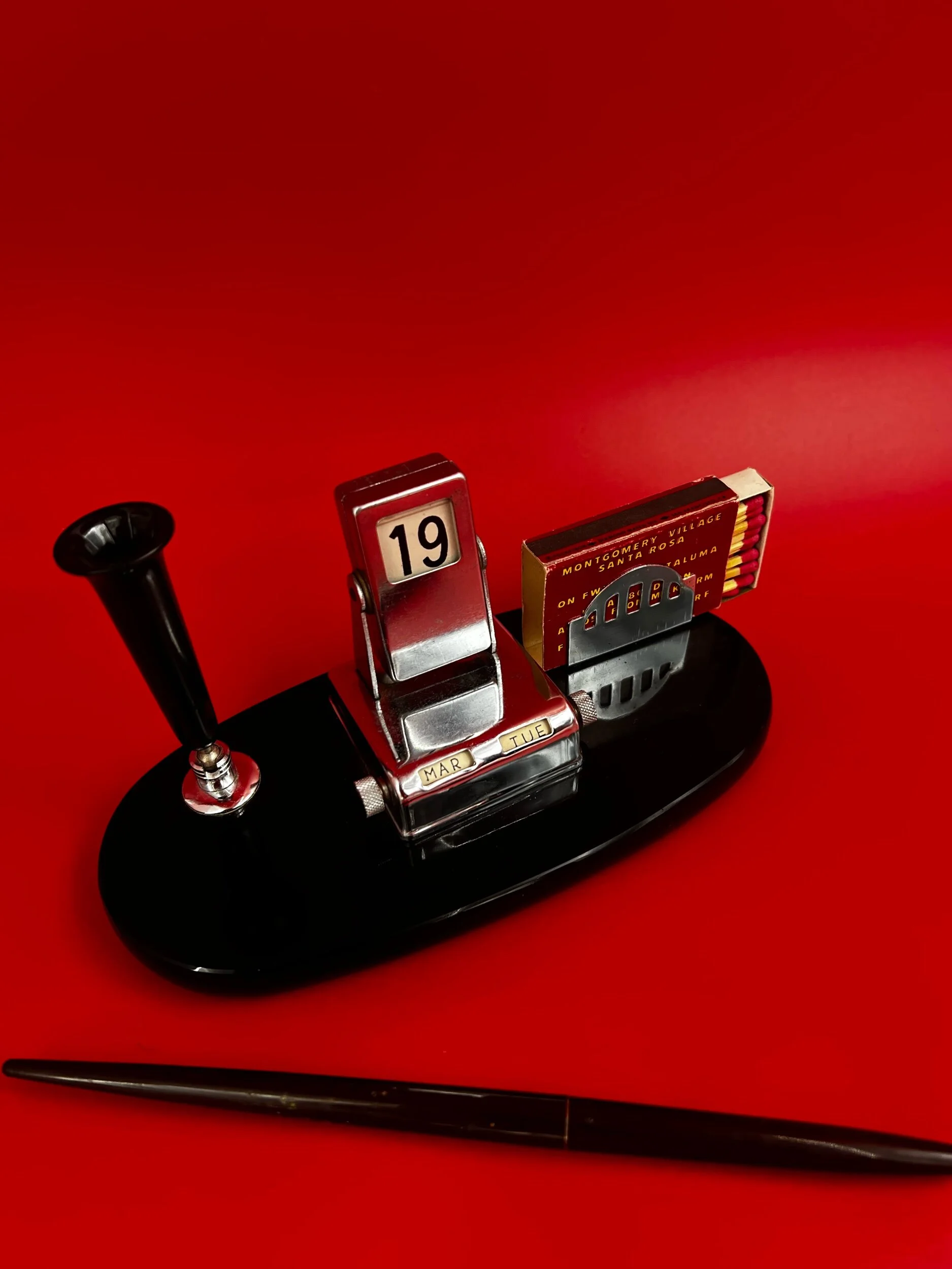 Oddities › RARE! 1950s Desk Set Image 1 of 3 Image 2 of 3 Image 3 of 3 RARE! 1950s Desk Set $850.00 50's desk set, pen holder, perpetual flip calendar art deco match book holder on black Bakelite base Add To Cart Added! 50's desk set, pen holder, perpetual flip calendar art deco match book holder on black Bakelite base