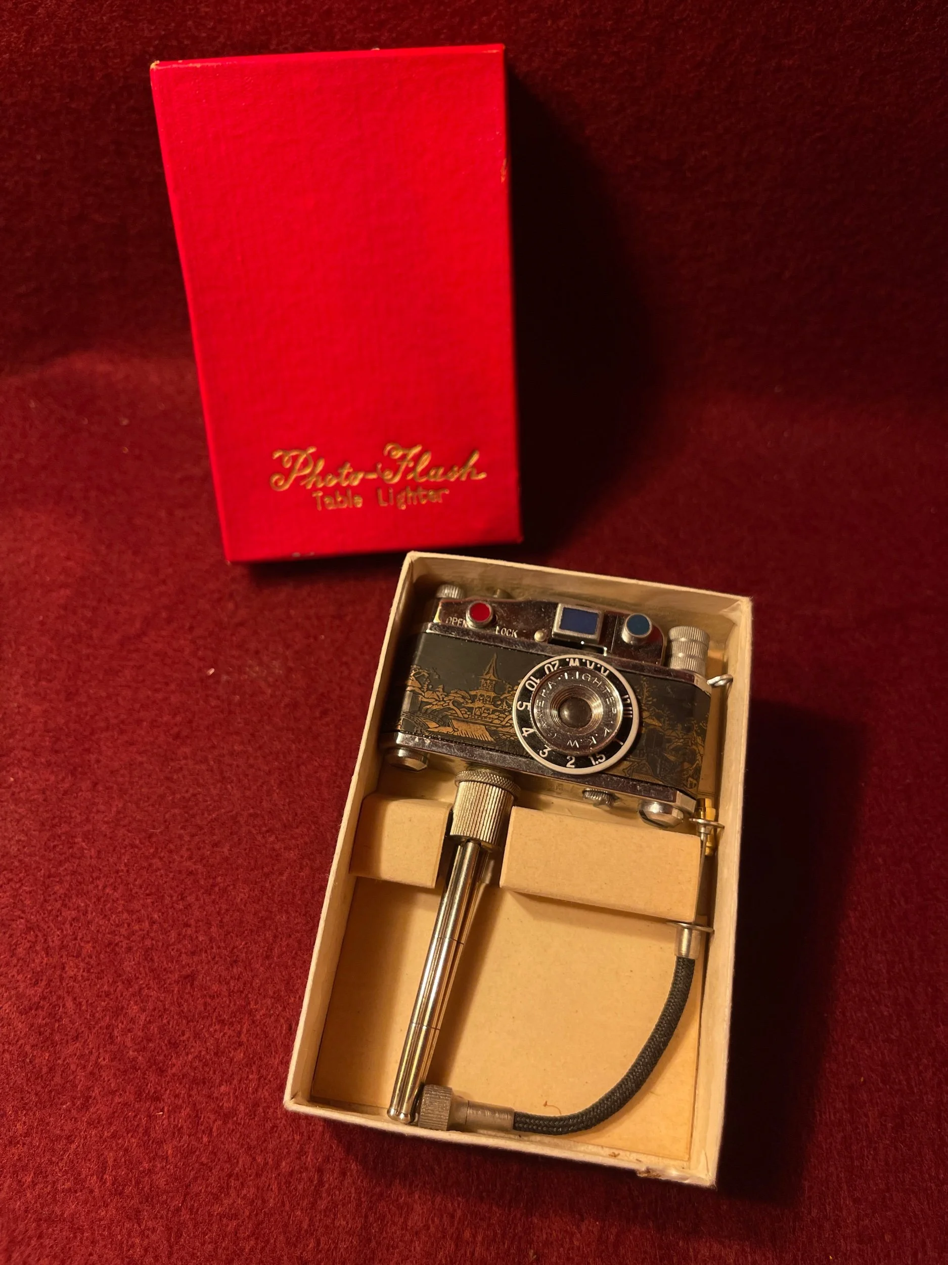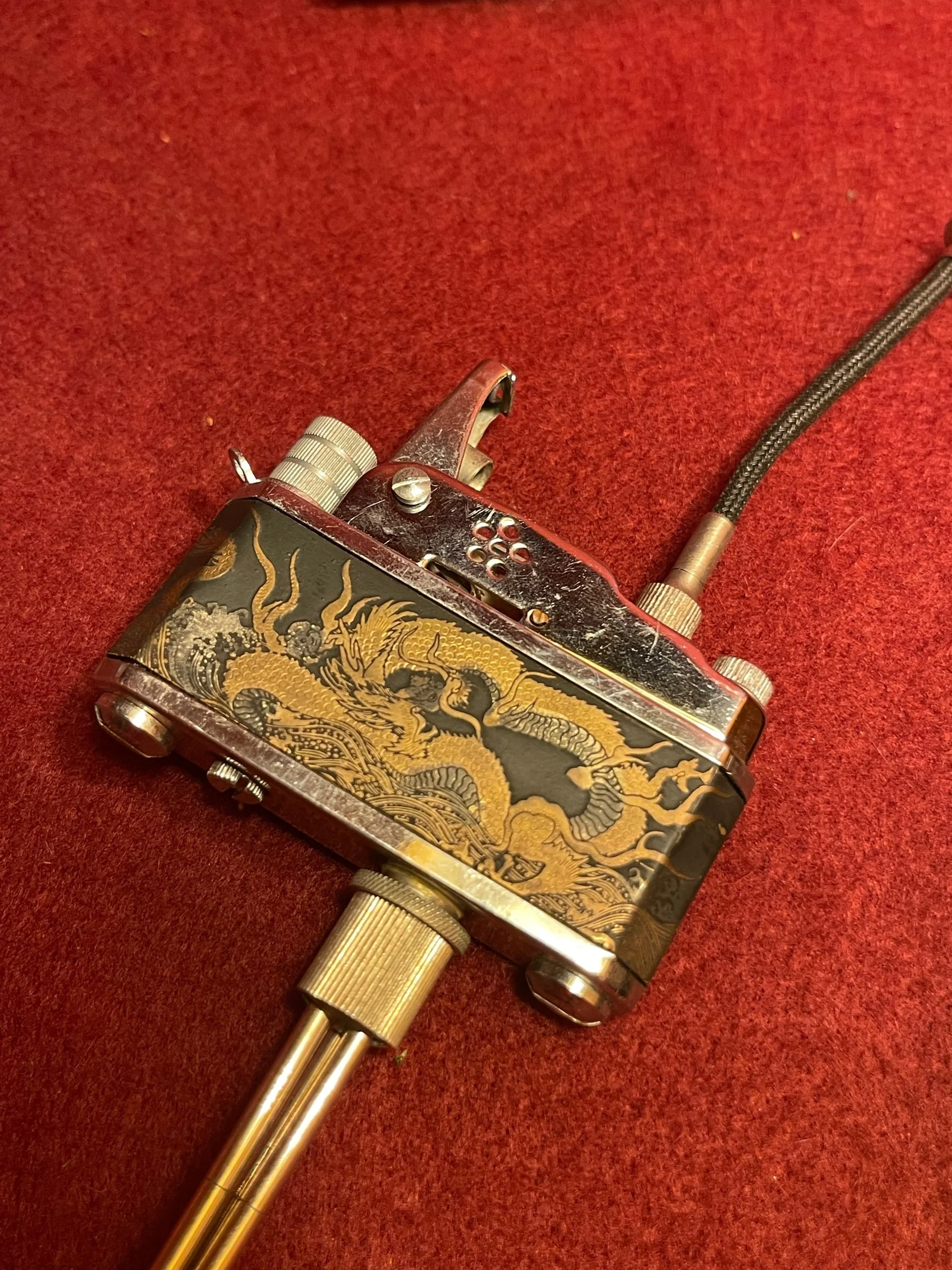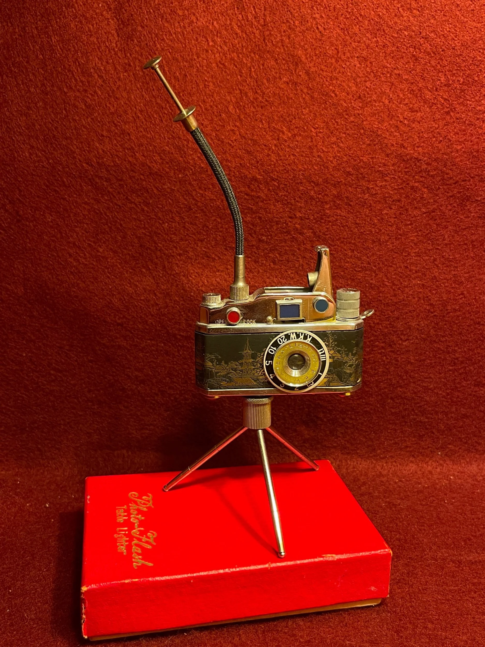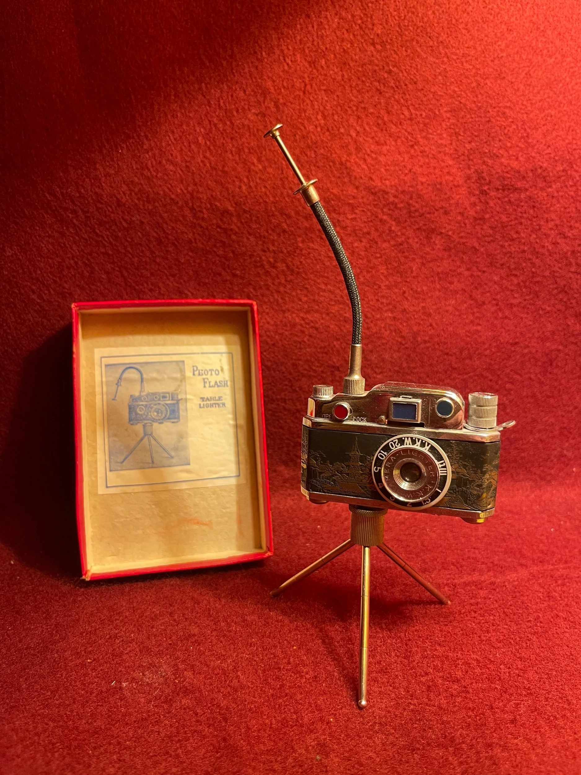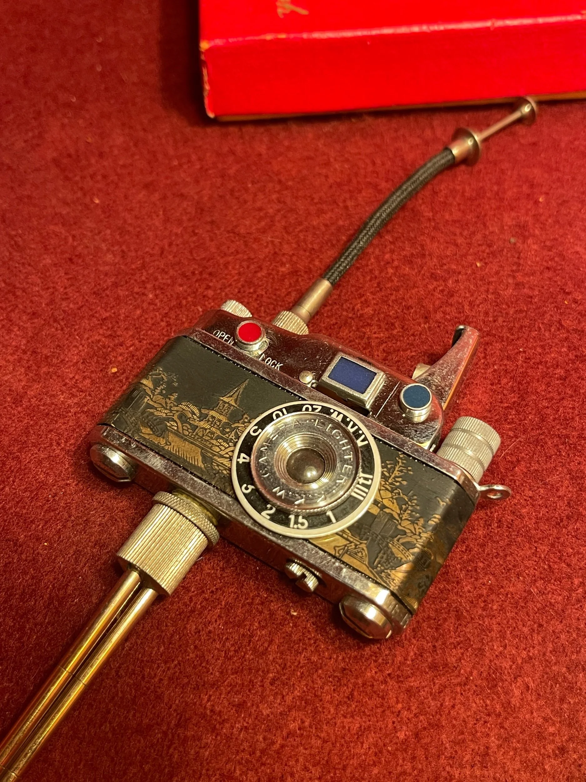 Extremely rare occupied, Japan camera lighter in original box. This one in particular has a brass dragon, inlay and push button release for flame. The base and push button release is removable to turn it into a keychain lighter if needed. There is a compartment for extra flints. This piece is in pristine working condition.