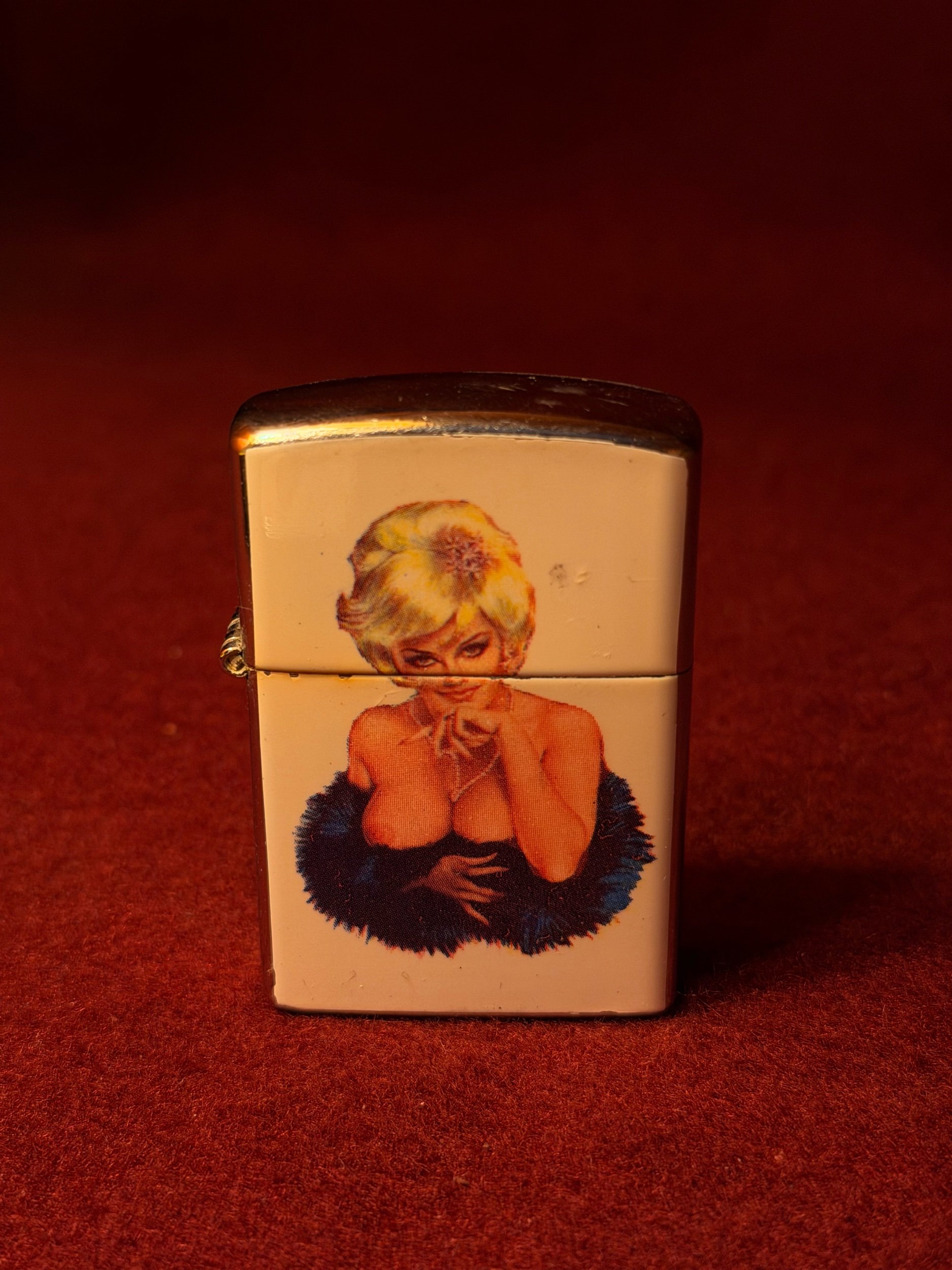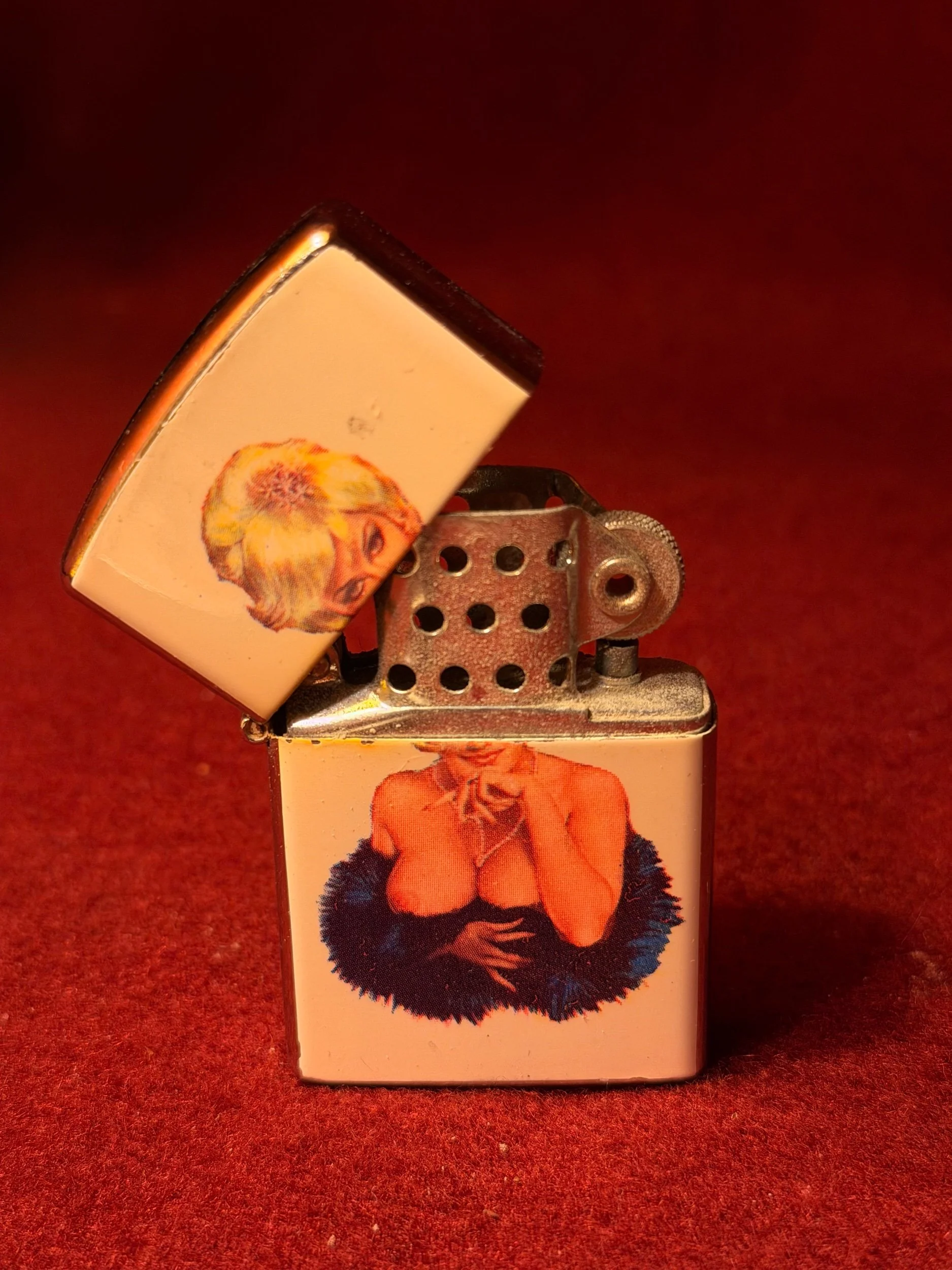 Tobaccania › Collectors Enamel Pinup Lighter Image 1 of 2 Image 2 of 2 Collectors Enamel Pinup Lighter $200.00 Highly collectible 1960s Enamel Pin Up Lighter. Fully Restored! Add To Cart Added! Highly collectible 1960s Enamel Pin Up Lighter. Fully Restored!